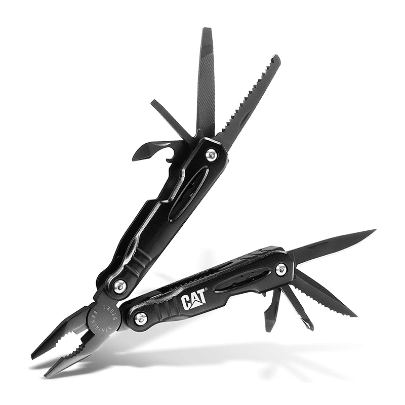 Tento multifunkčný nástroj CAT® s 13 funkciami je vybavený kliešťami s dlhým nosom, štiepačkou drôtu, otváračom na fľaše, veľkým / stredným / malým drážkovaným skrutkovačom, zamykateľným veľkým nožom, pilníkom s jedným rezom, pilníkom s dvojitým rezom, otvírkou nožom a veľkým nožom.