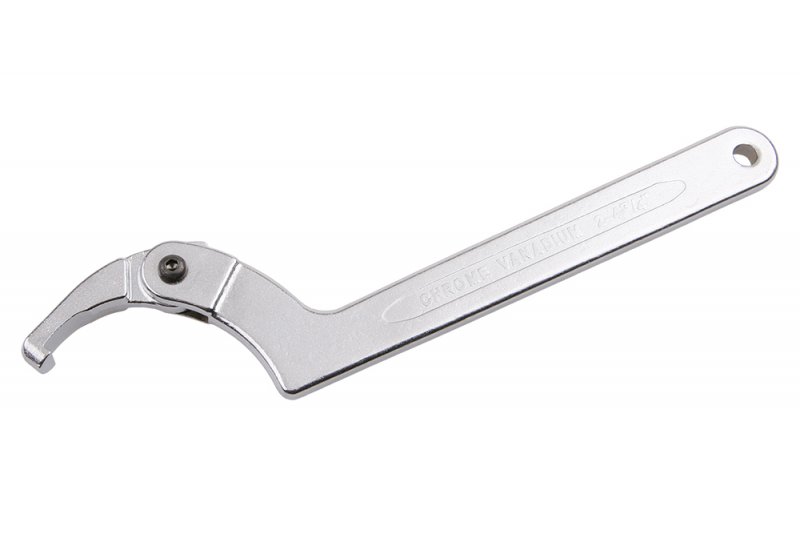 Nastaviteľný hákový kľúč pre goliere, krúžky a ložiská. Jediná čeľusť s upínacím kolíkom v priemyselnej povrchovej úprave. Pri používaní zaistite presné nasadenie háku čeľuste. Prevedenie: matný chrómovaný povrch, kovaný, chróm vanádiová oceľ.