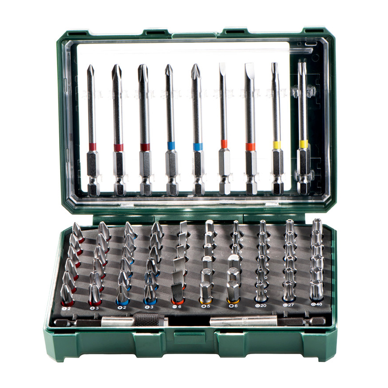 Bity z chróm-vanádiovej ocele (kvalita S2); bity s farebným kódovaním: na rýchle a jednoduché vyhľadávanie vhodného bitu; magnetický rýchlovýmenný adaptér + magnetický držiak bitov; vysokokvalitný pevný box so špeciálnym dizajnom Metabo s vyťahovateľným eurozávesom