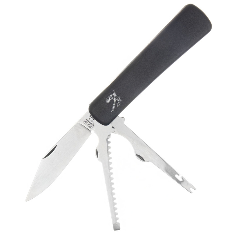 Viacúčelový rybársky vreckový nôž Mikov 338-NH-3 B, ktorým sa ľahko vypitve ryba, odstránia šupiny či odreže vlasec. Má čepele z nerezovej ocele 420 s kónickým plochým výbrusom a rukoväť z odolného čierneho plastu s motívom chytenej ryby. Dodáva sa v PVC puzdre.