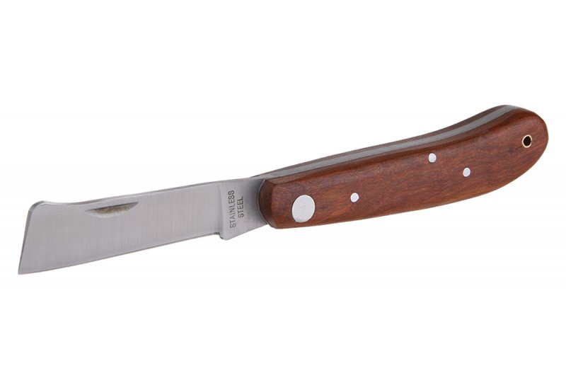 Očkovací zatvárací nôž, silná nerezová čepeľ, drevená rukoväť s kvalitným nitovaním, na očkovanie – rezanie a úpravu drevín a rastlín, dĺžka čepele 110mm, blister.