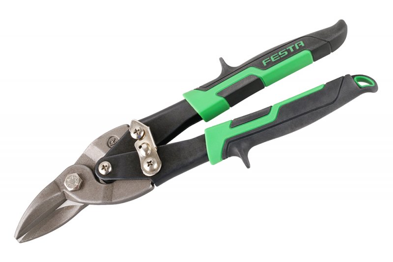 nožnice na plech PRAVÉ "R" RIGHT – pre strihanie plechu rovno a doprava čeľuste z vysoko kvalitnej Cr-Mo (chróm-molybdénovej) ocele s tvrdosťou 58 – 62 HRC prevodový mechanizmus pre uľahčenie námahy pri strihu pogumovanej rukoväte pre nekĺzavý