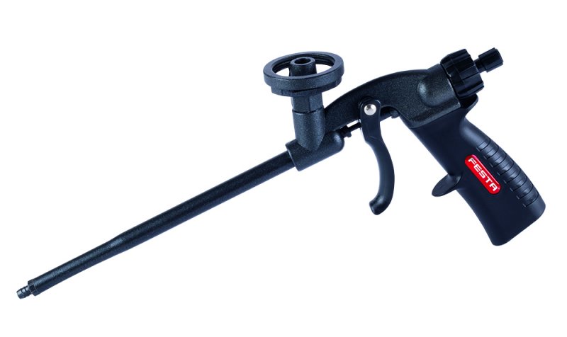 profesionálna celokovová pištoľ na PU (polyuratovej) pištoľovej peny s teflónovou povrchovou úpravou plynulá regulácia množstva peny, citlivá spúšť pre presné a pohodlné dávkovanie, plastové aplikačné trubičky na presné nanesenie peny na požadované miest