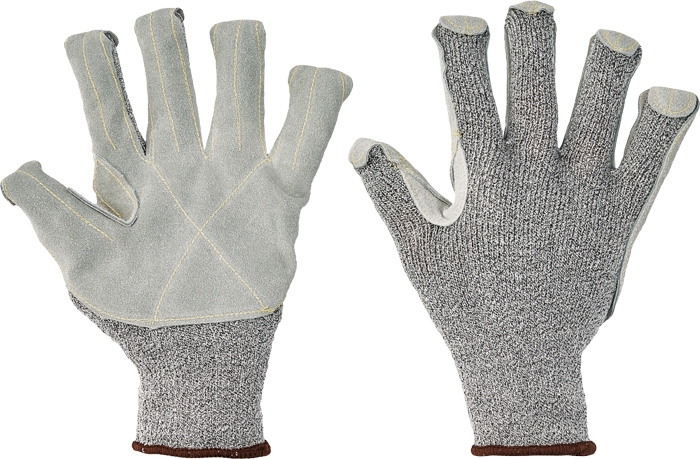 Pletené, bezšvové rukavice z modifikovaného skleneného vlákna, Spandexu a nylonu, so zosilnením z hovädzej štiepenky v dlani a na prstoch, zdvojenou vrstvou medzi palcom a ukazovákom, prekrytými špičkami prstov a odolnosťou proti prerezu tr. E.