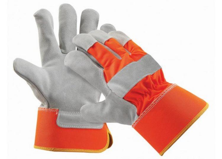 Rukavice z jednofarebnej hovädzej štiepenky v dlani s podšívkou a polyesterového úpletu v reflexnej farbe na chrbte a manžete.