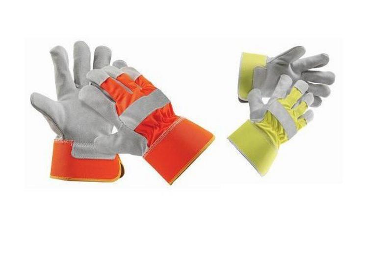 Rukavice z jednofarebnej hovädzej štiepenky v dlani s podšívkou a polyesterového úpletu v reflexnej farbe na chrbte a manžete.