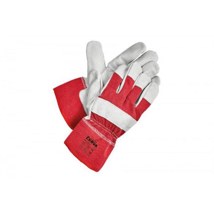 Rukavice z jedného kusa silnej hovädzej štiepenky v dlani s podšívkou, bavlnená tkanina na chrbte, s bavlnenou vystuženou manžetou, celokožennými palcami a ukazovákmi a prekrytými špičkami prstov.