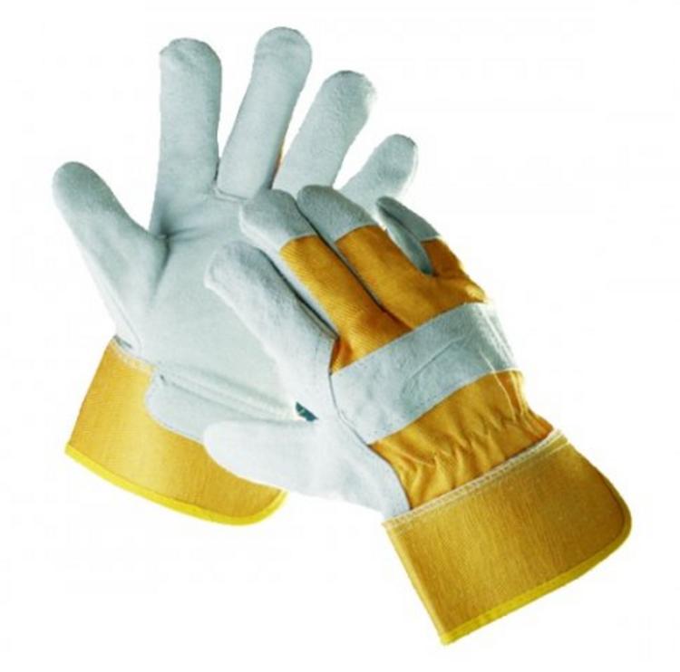 Pracovné rukavice EIDER z jedného kusa silnej hovädzej štiepenky v dlani s podšívkou, bavlnená tkanina na chrbte, s bavlnenou vystuženou manžetou, celokoženými palcami a ukazovákmi a prekrytými špičkami prstov.