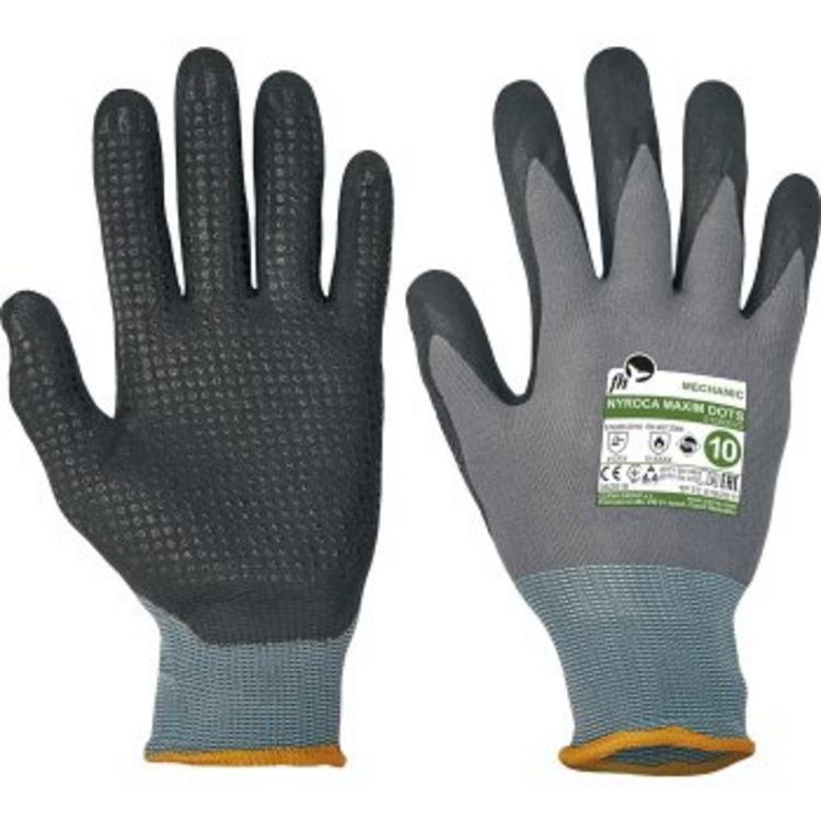 Rukavice z úpletu nylon/lycra máčané v mikroporéznom nitrile, nitrilové terčíky na dlani a prstoch, excelentná priedušnosť, veľmi dobrý úchop za mokra, v olejnatom prostredí i za sucha.