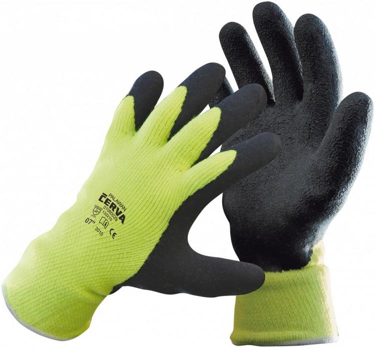 Zateplené pletené bezešvé nylonové rukavice s vrstvou mikorporézního paropropustného latexu v dlani a na prstoch a pružným nápletem na zápesti.