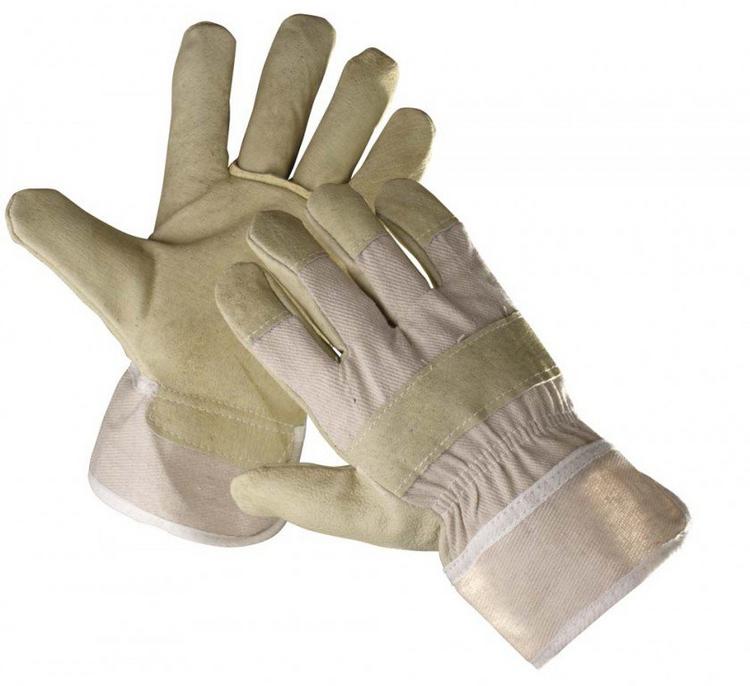 Rukavice z bravčovej štiepenky v dlani, bielej bavlnenej tkaniny na chrbte a manžeta s teplou podšívkou.