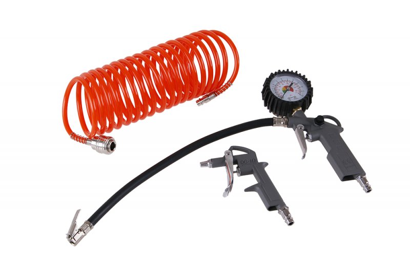 Kompresorová sada sa skladá z pištole nafukovacej s manometrom – pre ľahké plnenie stlačeným vzduchom (napr. pneumatík automobilov, kolies a pod.), ofukovacej pištole – pre vyfukovanie napr. kovového prachu zo zle prístupných miest, špirálová hadica 5m –