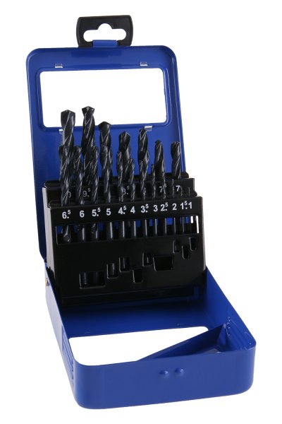 Súprava vrtákov do kovu HSS, spĺňajúca normu DIN 338, vrtáky sú vyrobené z vysoko kvalitnej rýchloreznej ocele (HSS), Volfrám 4%, Molybdén 3%, Chróm 4%, Vanadium 1%. V sade 19 ks, priemer 1,0 – 10,0 mm.