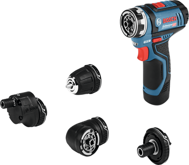 Upínanie Bosch FlexiClick s integrovaným magnetickým držiakom skrutkovacích hrotov umožňuje nasadenie držiaka skrutkovacích hrotov, nadstavca so skľučovadlom, uhlového nadstavca a excentrického uhlového nadstavca