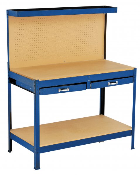 kvalitný kovový pracovný stôl – vhodný do malých dielní, garáží, pivníc konštrukcia rámu z kovového plechu s práškovým lakom proti korózii dve praktické zásuvky s vodiacimi lištami ľahký chod výsuvu sololitová odolná pracovná doska aj spodná odkladacia d